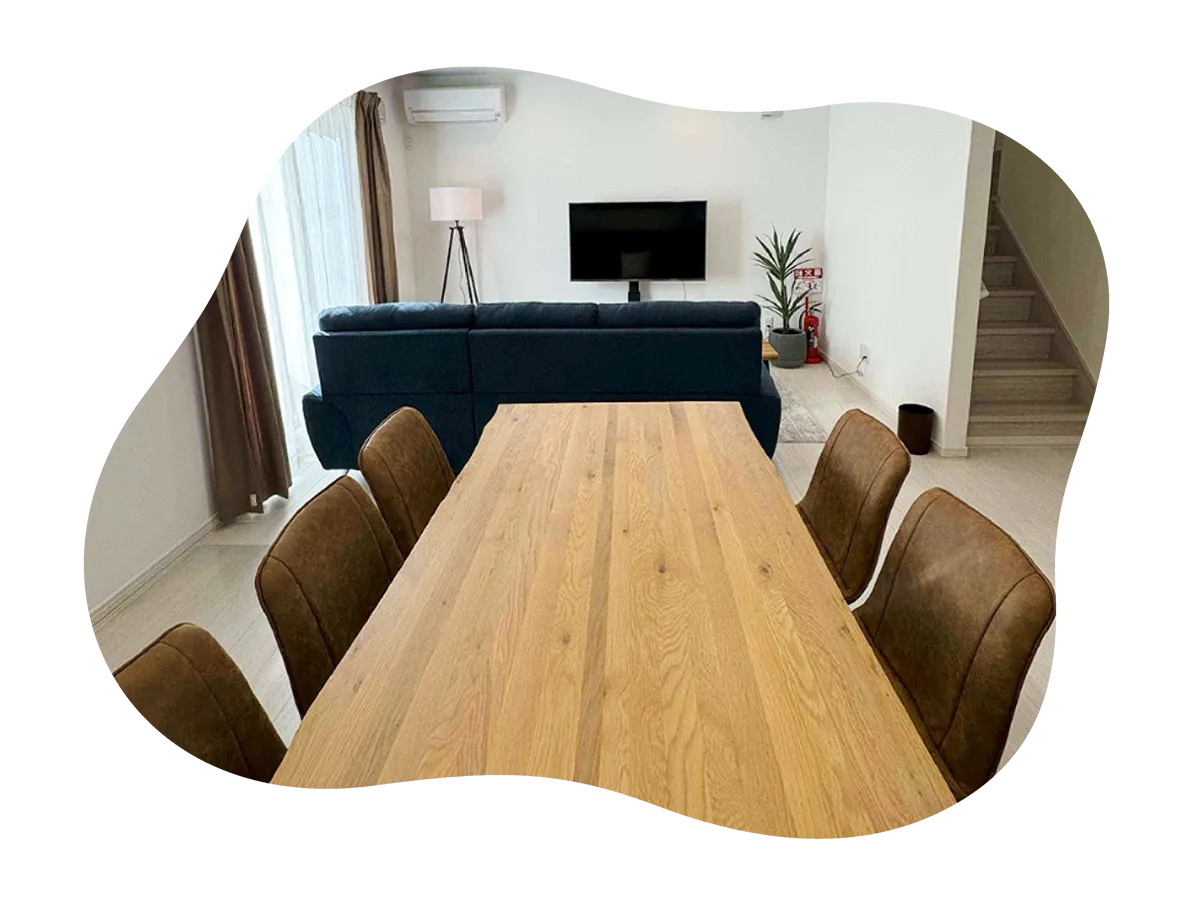 広々としたリビングルームには大型テレビやゆったりソファ、6名掛けのダイニングテーブルを完備しており、家族旅行や友人同士の滞在にも最適です。