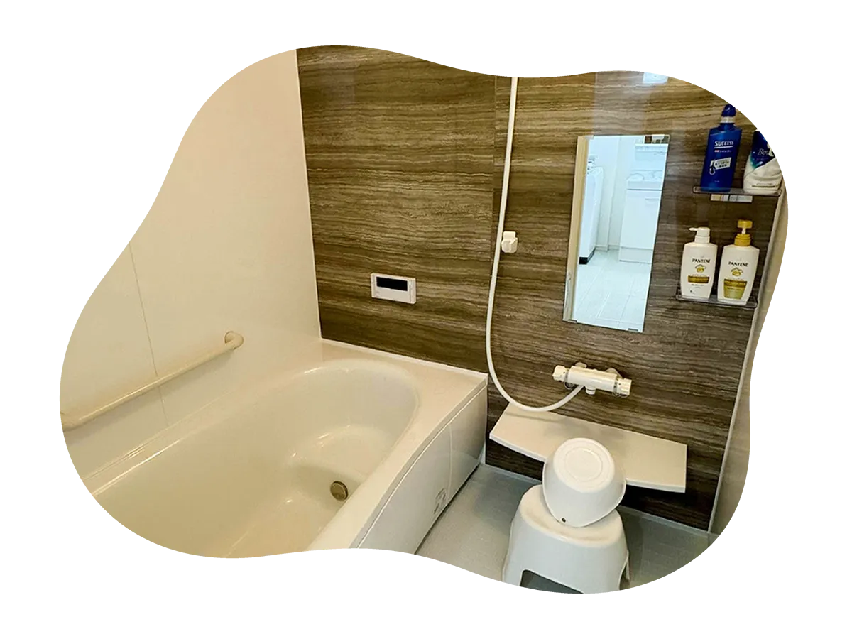 キッチンには大型冷蔵庫や調理機器、食器類も揃っているため、長期滞在でも自由に料理を楽しめます。洗濯機(洗剤付き)もあるので、観光や出張での連泊にも便利です。